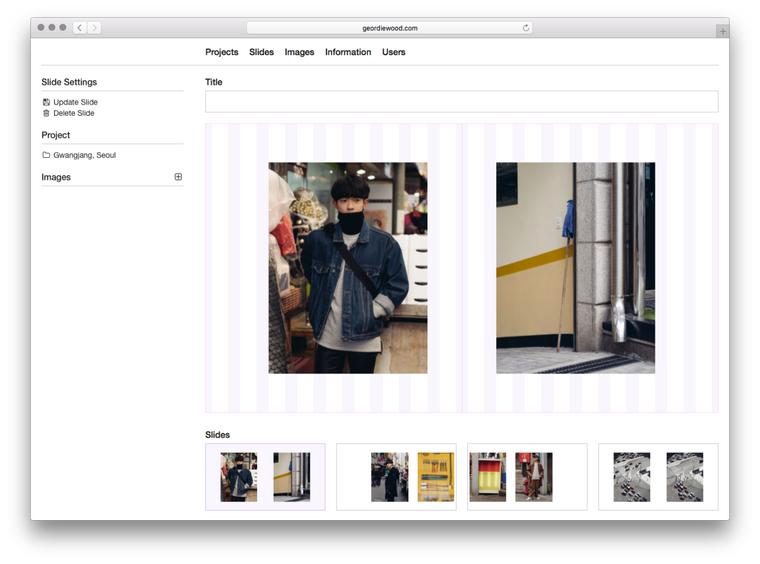 With this Geordie can simply upload images and drag and drop them into the layout grid. They fall where they’re dropped — snapped to the nearest column — and a click can set their width. I used the standard HTML5 drag-and-drop API for this: